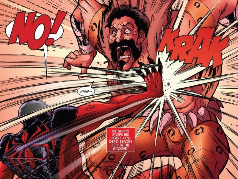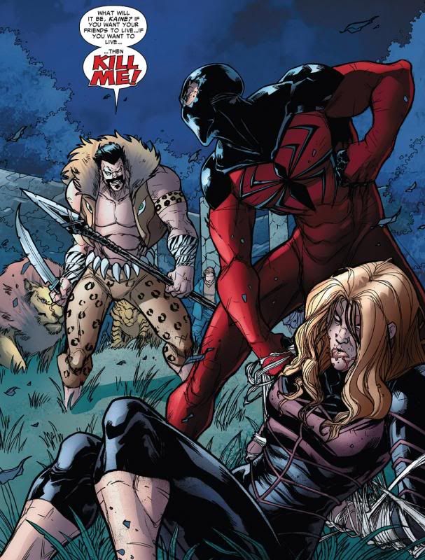 Kraven goes back to smacking Scarlet Spider around some more before finally telling his daughter to just kill them all. That finally gets Kaine to act.