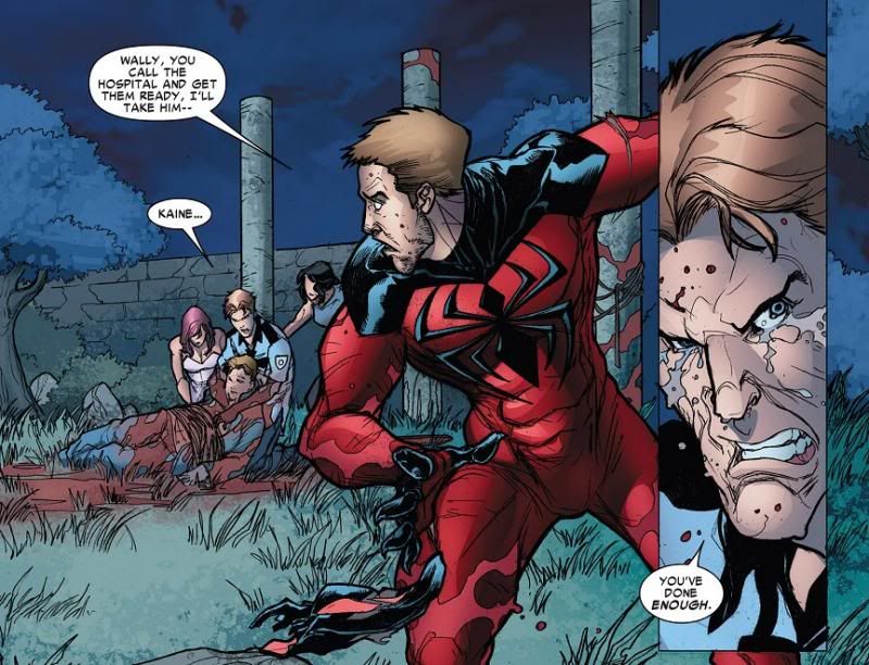 Anyway, Kaine rushes to Donald’s aid, but he’s pretty helpless to do anything. Wally demands to be cut down, his face awash in anger and tears. Kaine webs up Donald’s gut wound while the others attend to him. Kaine slashes Ana into submission, then decides to be a hero and revives Kaine by punching his chest a whole lot. I don’t really think that’s how that sort of thing works, but such is the power of thumping one’s chest in fiction. Kaine brings Kraven back to life to prove to himself that he’s a hero.