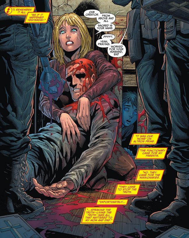 Kid Flash has been hooked up to a fancy future machine, which is reading his memories and broadcasting them on view screens for the Titans and the future space cops. His story begins when Bar Torr was only 8-years-old on the planet Altros Prime, living with his religious parents and his sister, Shira. They lived under the rule of the Functionary, who sent a squad of Purifiers to kill his parents for speaking out against the Functionary.