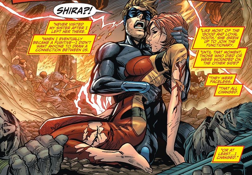 But almost killing his sister is enough motivation for Bar to turn traitor on his people. He turned himself in to the Functionary and ratted out everyone in the rebellion. And here is where things get kind of weird. I’ll just post the page so you can see for yourself. Somehow, the story goes from Bar betraying the rebellion…to him being shipped into the past to become Kid Flash.