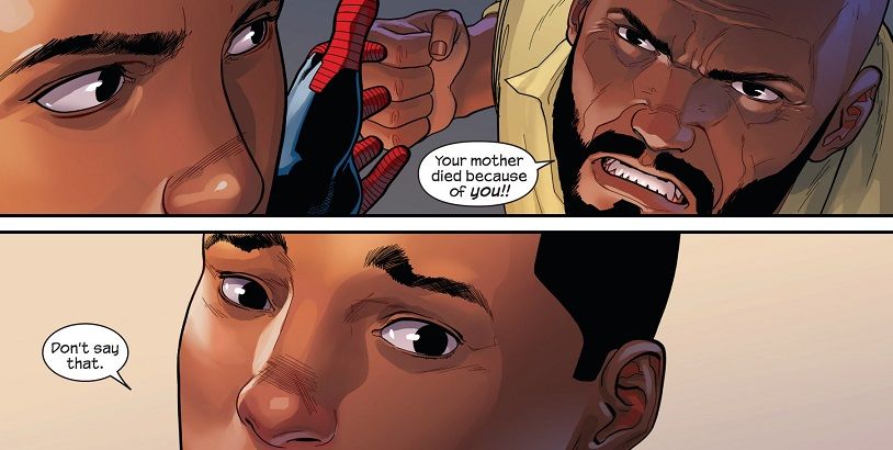 If you haven’t already heard the good news, it seems that Miles Morales’ life as Spider-Man gets to continue in the Ultimate Universe. He’s not jumping over to the regular Marvel Universe. He’s not dying. Miles gets to live on and continue having adventures, which is fantastic news. I want to keep reading Miles Morales comics for the rest of my natural born life. I want to read Miles as an adult Spider-Man, like normal universe Peter Parker. That’s all I’m about: want, want, want! Unfortunately, I have been denied the excellence of Brian Michael Bendis’ original plans for Miles revealing his identity to his father, and that’s a shame.