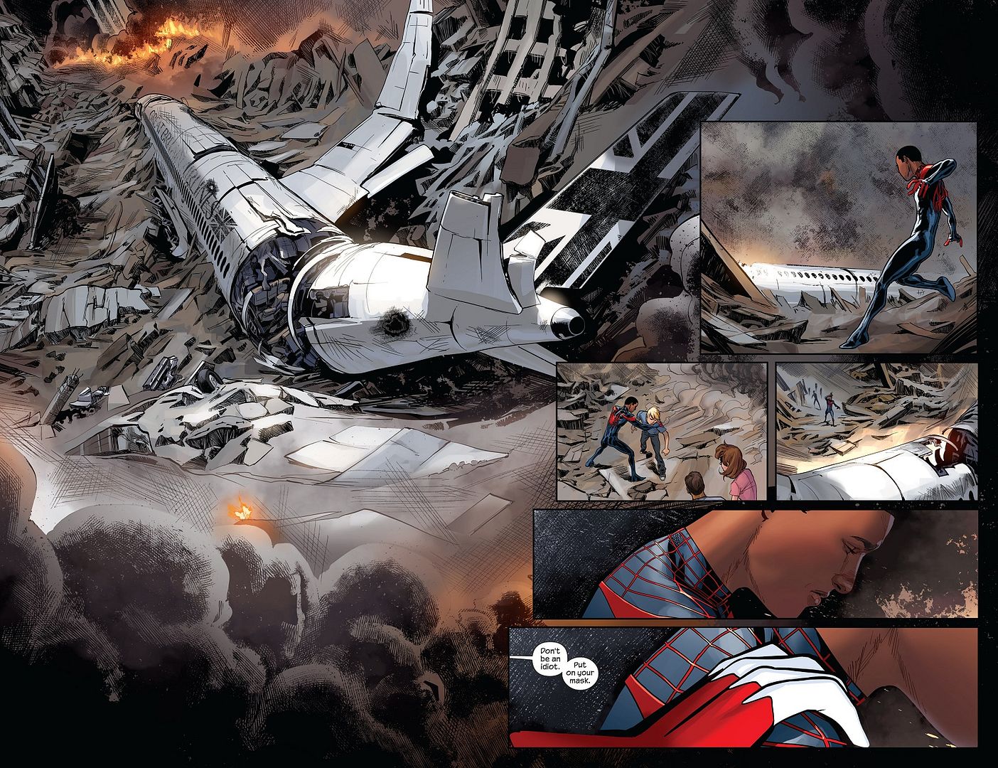 Spider-Woman joins him, and together they get a few people to safety and then break into the plane. The only passenger on board is, randomly, J. Jonah Jameson. Miles barely recognizes him, but it doesn’t matter, he just tries to get him to safety. He gets Jonah away from the plane in time to avoid an explosion. There’s something Jonah seems to want to tell Miles, but Miles tells him to keep it to himself while he goes off to help other people.