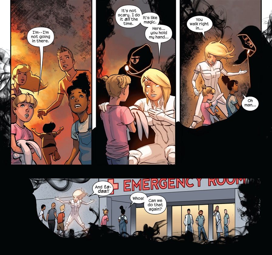 The two Spider-heroes keep people away from the fire and try to figure out how they’re going to help all of these people  – which is when Cloak and Dagger show up to lend a hand. Cloak turns his dark portal into a one-way trip to a hospital in Pittsburgh.