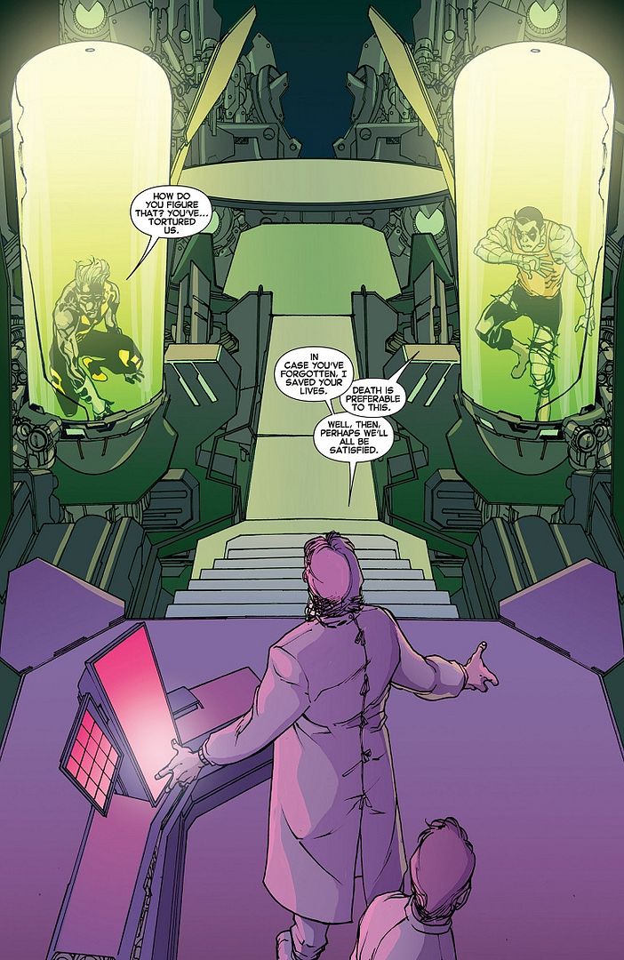 Anyway, there isn’t one for Polaris, so she just gets pissed and uses her powers to start tearing the walls down. She sets off some kind of gas attack, so she forces her way through a wall and randomly finds herself in the lab where Hoffman is keeping Fatale. They recognize each other immediately for some reason. I guess all mutants generally know each other on sight?