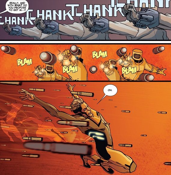 Hoffman falls, defeated, and the energy immediately disappears, leaving him just a normal, brain dead man lying on the floor. Reaper goes to bash his head in, but Quicksilver stops him – and the arrival of the speedster just pisses the lot of them off. They’re all still holding a grudge, remember?