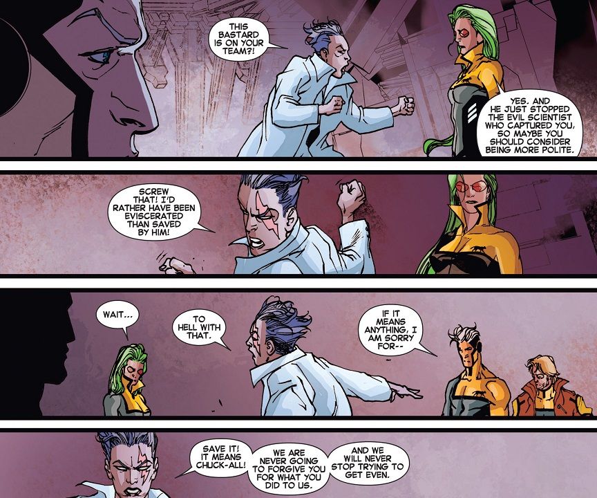 Polaris tries to get Fatale to calm down, and Quicksilver tries to apologize, but none of these Z-listers are hearing it. Fatale threatens that they will never forgive Quicksilver, and they will never stop trying to get even.