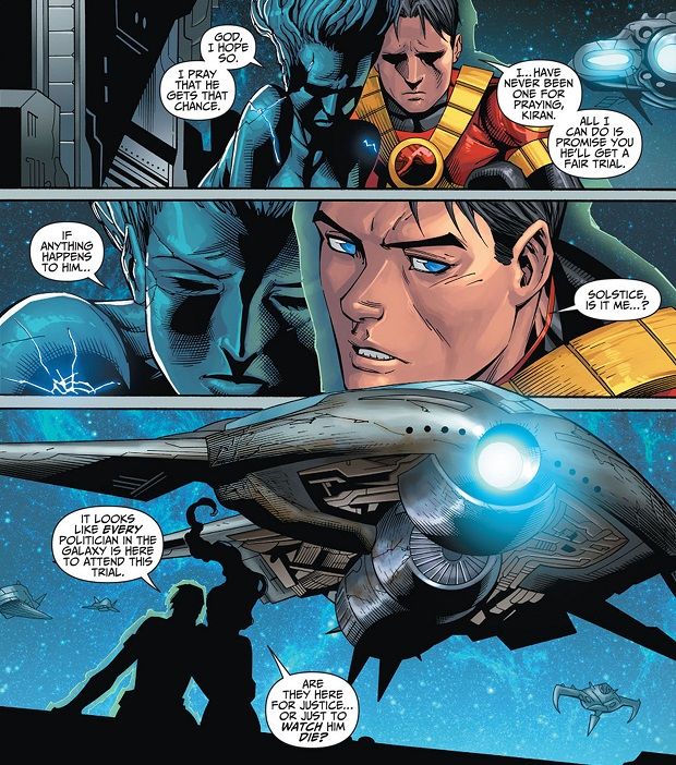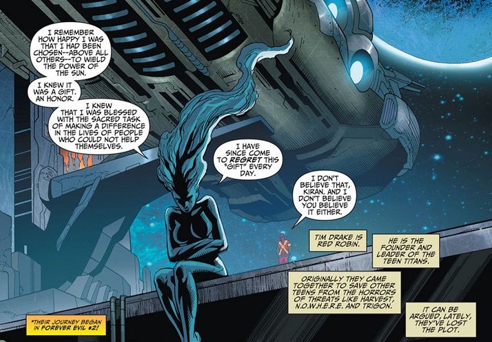 Red Robin comes to sit next to Solstice to try and convince her that the Teen Titans still stand for something good. And, most hilariously of all, it seems that everybody might have forgotten that Tim Drake can’t breathe in space (though Solstice apparently can), because he has some random, unexplained green aura drawn around him!