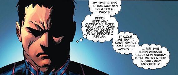 Speaking of abrupt character changes, we next move on to Jon Lane Kent, staring out a window complaining to himself how he can’t just kill the Teen Titans.