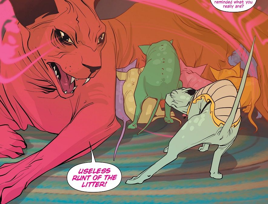 We open in mid-battle! Lying Cat has Clara on the floor, and Gwendolyn heads upstairs to find Marko. The lighthouse is on fire, and Heist lies dead nearby. Clara fights back and stabs her thumb into Lying Cat’s eye. Then Lisbeth shows up to frighten the Cat away, forcing it to confront that it doesn’t have the authority to be here. Because if nothing else, “Lying Cats always play by the rules.” I guess that’s a thing about Lying Cats.