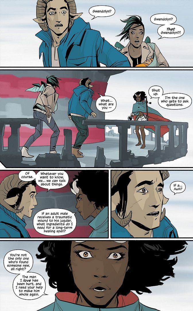 Marko is more than happy to help. He tells Gwen that they need to find some snow for the healing spell, but when she tells him that her friend is a foreigner, Marko winces. The magic will only work on someone from Wreath. He can’t save The Will. Gwen gets mad at him, but Alana steps between them and suggests she take The Will to a nearby Landfall outpost. Of course, Gwen doesn’t take kindly to Alana opening her mouth and points The Will’s lance at her.