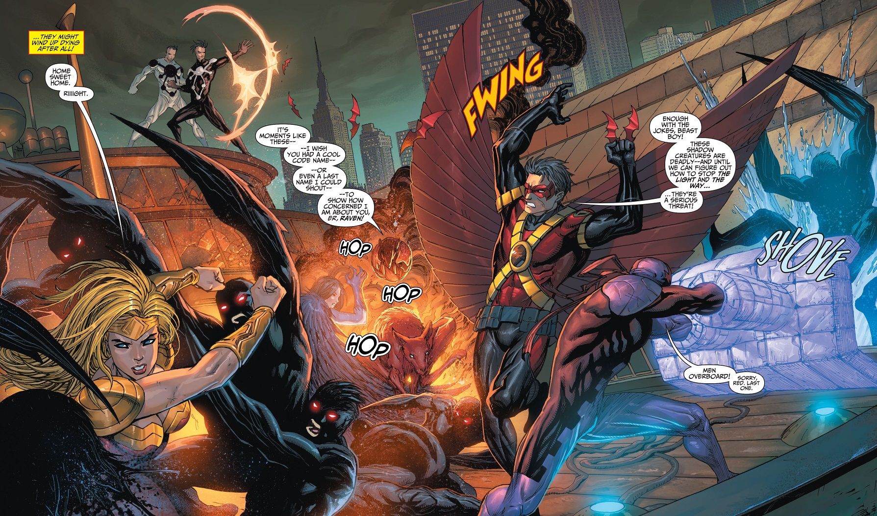 The bad dialogue starts right away, almost immediately. The Titans have returned from the future, reconnected with Beast Boy and Bunker, and find themselves fighting the shadow puppets of new villains The Light and The Way. Try and follow Beast Boy’s train of thought in this opening spread. Click to enlarge the picture.