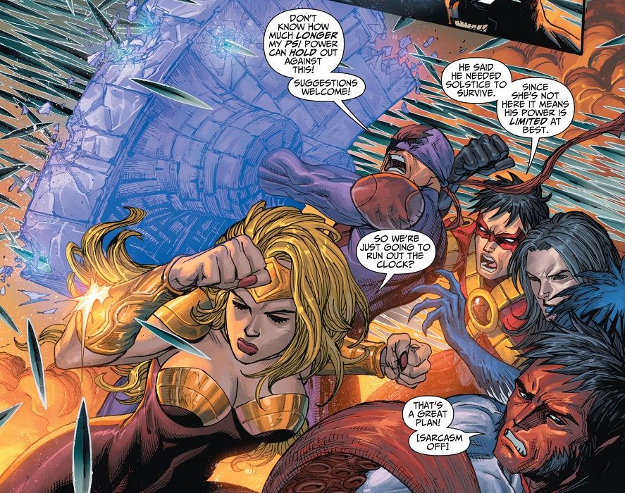 Because that makes sense. Also making sense is the fact that Kid Flash still has his powers and Solstice doesn’t. There is no logic to this criminal justice system.