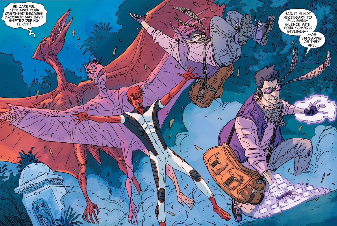 The two of them hug and Kid Flash tells Solstice that they will always be Titans, and together they will tame and liberate this planet. Meanwhile, there are some weird aliens flying around on monsters nearby. Sigh.