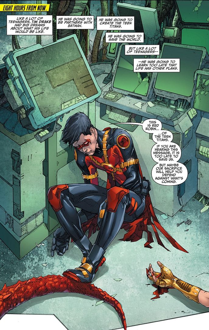 We open with one of those stupid ‘flash-forward’ teaser tropes, where Red Robin sits among the fallen bodies of his teammates 8 hours into the future and records a message to some unseen recipient about how the Teen Titans tried their best. Believe me when I say this is just a dumb tease and Tim’s dialogue doesn’t line up at all to the actual scene later in the issue.