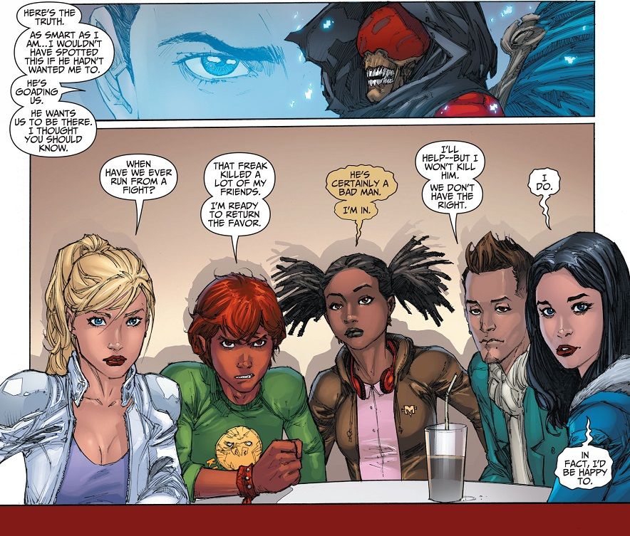At the table, Tim tells everyone that Harvest has set up a new Culling in Africa and is being so blatant about it that Red Robin figures it’s a trap. Harvest wanted to be found and wants the Titans to come.