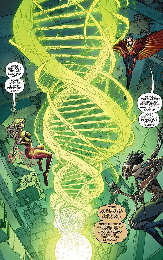 Anyway, the Titans meet up later to try and decide if Harvest is telling the truth. Some think he is, and some think he’s lying through his teeth. Raven is monitoring the situation and teleports the Titans into one of Harvest’s labs, where they find a giant, glowing DNA helix.