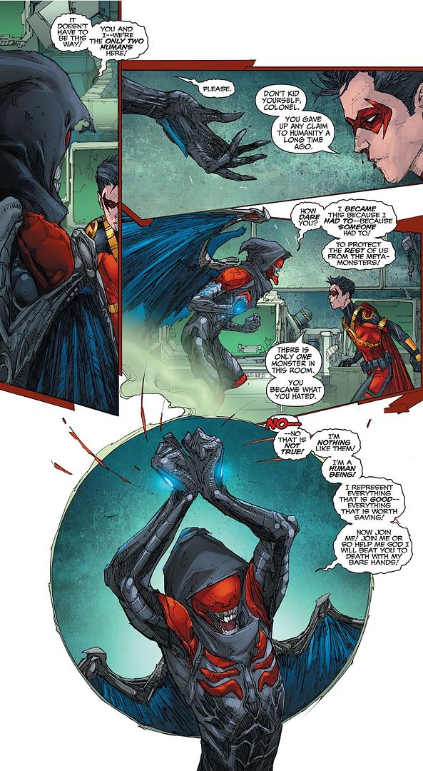 Red Robin then delivers a brief summary of his superhero career, so pay attention Tim Drake fans, this is kind of an important puzzle piece in figuring out his New 52 backstory.