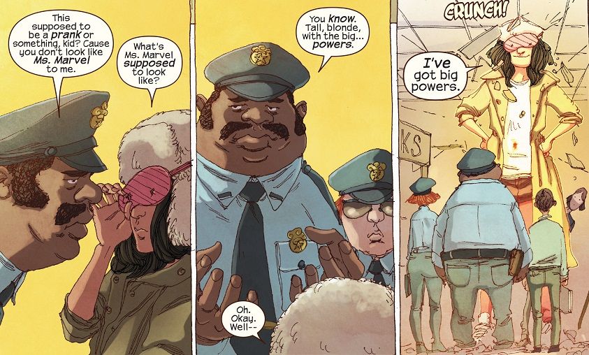 Ms. Marvel has been shot! And in her weakened state, she reaches out to her friend Bruno and reveals her true identity, shapeshifting back into Kamala Khan – but that has the added side effect of healing her bullet wound! She’s fine! Kamala comes clean to Bruno about everything, and he helps her protect her identity when the police arrive, responding to Bruno’s 9-1-1 call. Kamala puts on a sleep mask and announces herself as the new Ms. Marvel, complete with powers and the day saved!