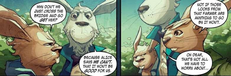 The art by Barnaby Bagenda has a nice painted style to it. He avoids heavy black lines, but still manages to paint expressive faces for his wide variety of characters, be they human, animal or a bit of both. He seems especially skilled in drawing sentient rabbit faces. Artist Sami Basri takes over the later chapters in the book, and personally, I like him a bit better. I was already a fan of Basri’s work at DC Comics, and his solid lines give a lot more definition to the characters. The last two issues in the volume have a more comic book feel thanks to Basri, and it really elevates the story. Not that Bagenda’s work was bad, it’s just that Basri takes the series to a new level of professionalism. His epic, two-page spread of Wonderland is a sight to behold.