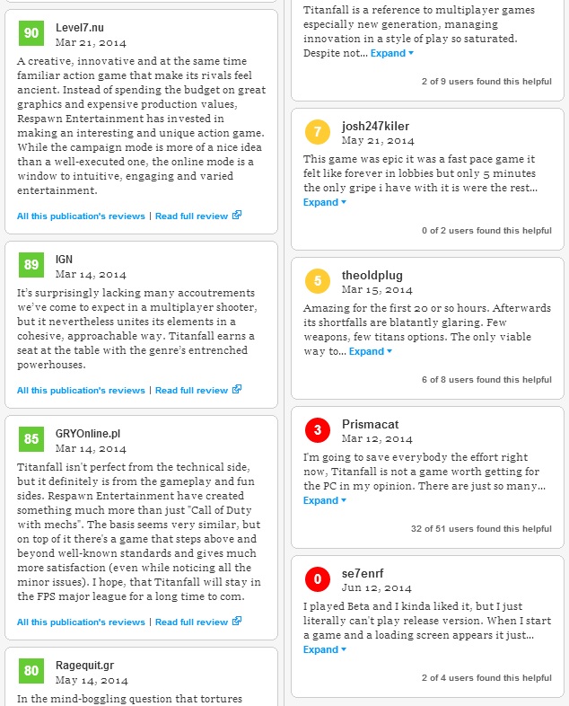 This is a section from the reviews of Titanfall on Metacritic. The column on the left was written by professional critics, while the column on the right was written by gamers. Titanfall received 27 positive reviews, zero negative reviews, and one mixed review from gaming review websites. From private gamers, the game received 200 positive reviews, 69 mixed reviews and 135 negative reviews.