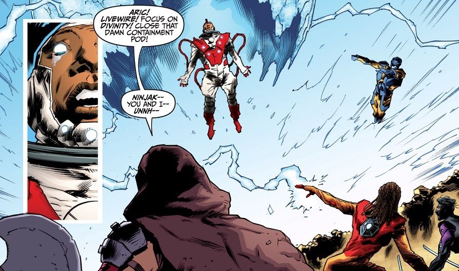 Divinity has used his powers to bring his wife and daughter back to life, but his wife immediately realizes that something is wrong and tells him that they lived full lives and don’t belong here anymore. While he’s crying about losing them again, the Unity snap out of their funk and launch their attack to trap Divinity in an energy bubble. They have to fight off all of Divinity’s disciples, but they do eventually manage to trap him while he’s distracted.