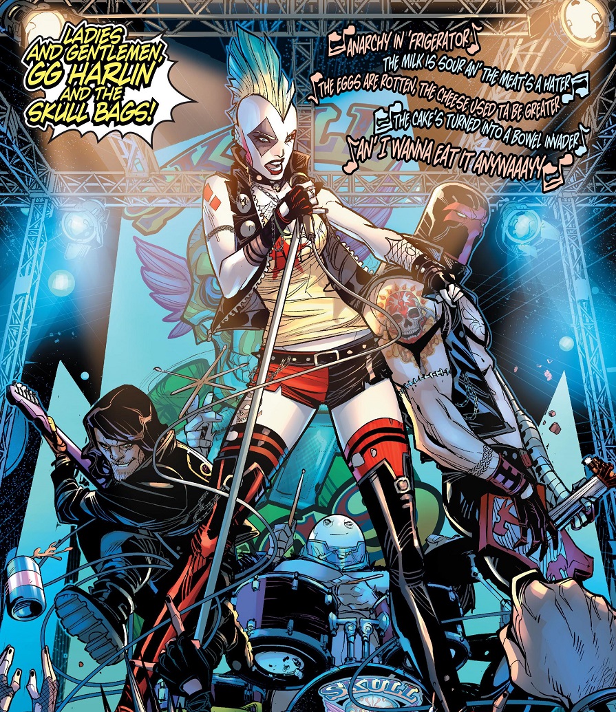 GG Harlin and the Skullbags perform at the rock show, but the audience absolutely hates them — so Harley Quinn drags one of the haters on stage and beats him to a bloody pulp, which immediately turns the hardcore audience around in favor of her band (the guy owned a dog-fighting ring and the Harleys planted him in the audience to get beat up)! Purple Satin notice their awesomeness and invite Harley to party with them after the show, with Harley planning an ambush with her peeps.