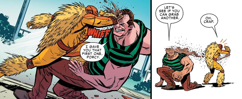 But these are superhero comics, and I don’t hold it against this issue that they randomly threw Sandman into the mix. Hopeless did a great job giving us an interesting brawl, highlighting Porcupine and his efforts to reform, with Jessica’s help. And we got a lot of great everyday banter and chatter as the two platonic friends spent some quality time with their kids. Jessica is even great with Roger’s daughter!