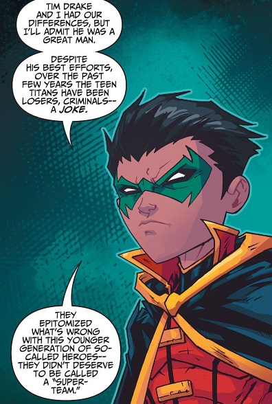 Damian Wayne has turned 13, and since he doesn’t have any friends, he’s decided to make some by forming a new Teen Titans in the wake of Tim Drake’s death. So he kidnaps Beast Boy, Raven, Starfire and Kid Flash and holds them prisoner in their new base, gloating at how he picked apart their weaknesses and easily defeated them. But the Titans break free, defeat Damian’s pet monster, and confront him over his rude behavior. Damian gives them a speech about not having friends, about making something of himself and about making a better Teen Titans, and everyone is soft-hearted enough to probably go along with him.