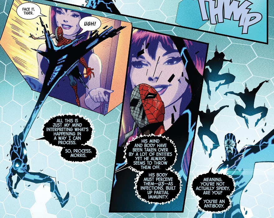 My point is, that’s not the real Spider-Man. That’s not his fetal position self taking arms against Mosaic. It’s some kind of mental defense system.