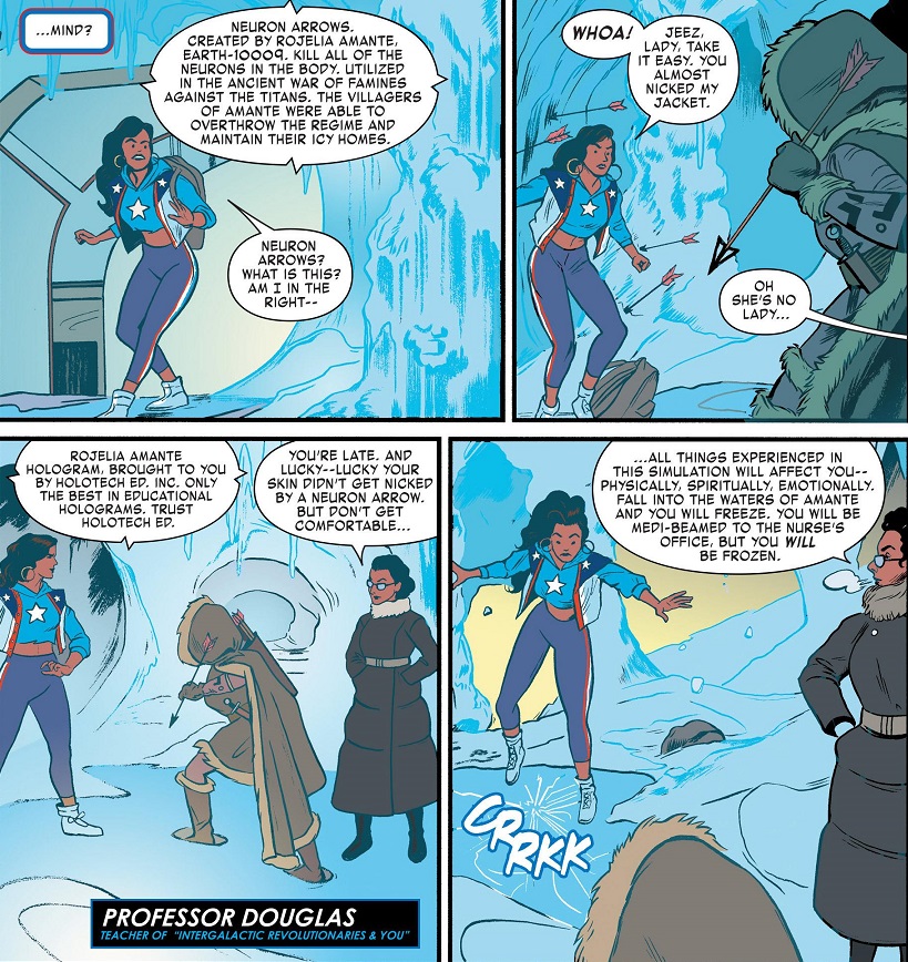 Despite being leader of the Ultimates and leading them on awesome interdimensional battles against strange villains, America Chavez wants to go to college to better herself. Her girlfriend doesn’t want that life and they break up, with America taking it harshly personally. Sotomayor University is a pretty crazy campus on what I’m pretty sure is planet Earth, but they’ve got some far out lessons and tech on this campus. America gets some guff from her Intergalactic Revolutionaries professor, but is joyed to see her friend Prodigy in the class.
