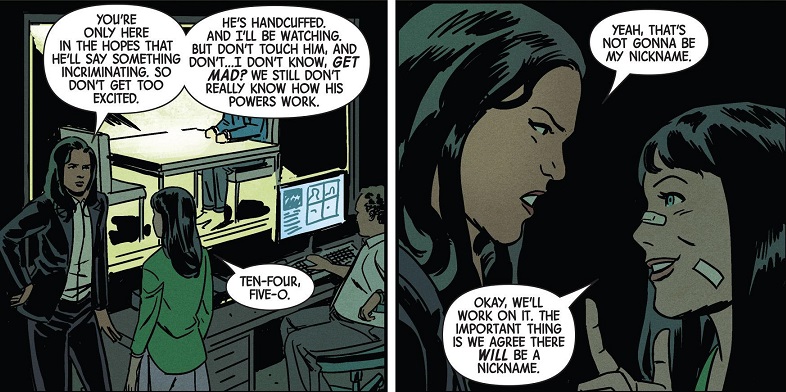Later, after checking in with all of her new friends, Kate gets called to the police station to help question Aggregate. But as soon as he recognizes Kate and starts to mention her father, his head explodes! Someone else is behind all of this! And they might be connected to Kate’s dad! When she returns to her office, Jessica Jones is there, and she’s captured the man Kate came to California to find: Brad!