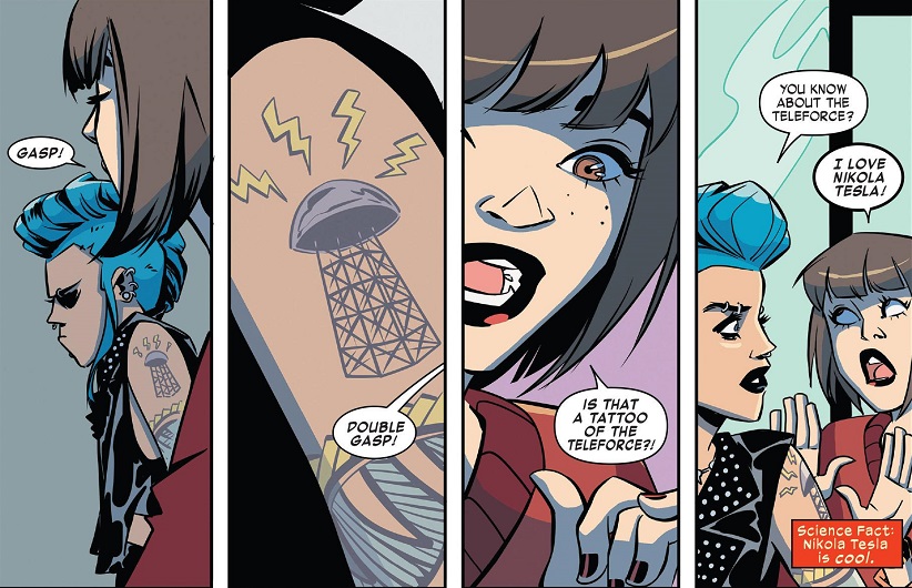 While getting a new phone, Nadia meets a badass punk genius girl named Amber. They hit it off when Nadia recognizes Amber’s Tesla tattoo. Then after a phone call from Janet Van Dyne reminding Nadia not to miss her appointment with her lawyer, Nadia and Jarvis visit Lashayla Smith in Brooklyn and recruit her to the lab. Lashayla has been experimenting with teleporters.