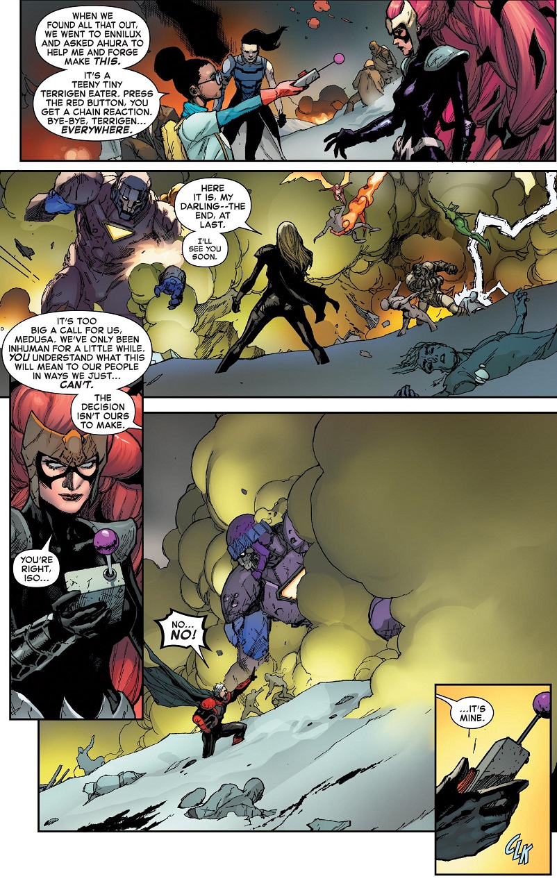So it’s as simple as that, huh? Medusa finds out that the Terrigen is about to saturate the planet and kill all mutants and she doesn’t even hesitate to destroy the cloud? She ends the entire conflict with the press of a button, simple as that?