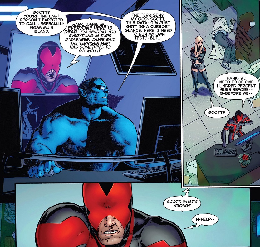 From Death of X #1. Cyclops dying from Terrigen while informing Beast that it’s poisonous