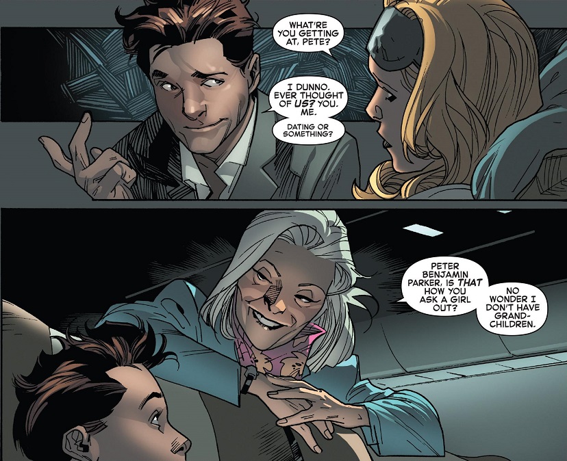And you’re probably right about the civilian being a better match for Peter Parker, but I’d like to see him have some kind of relationship with a fellow superhero. I’m a sucker for a good romance in comics, and it’s something that has just never happened before on any legitimate level. He’s got plenty of civilian girlfriends/wives in his past. This would be something new. The idea, then, that it wouldn’t work and wouldn’t be perfect would be part of the fun.