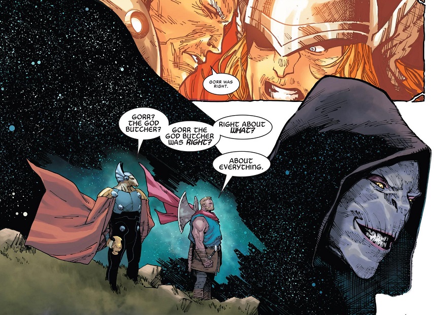 Gorr the Godbutcher argued that ‘gods’ are not all that great (to paraphrase). Odinson says he now agrees with Gorr, that gods are not all they’re cracked up to be (to paraphrase) and that no god is worthy to lift Ultimate Mjolnir. So instead, they should just crack open the mead and live whatever life they can.