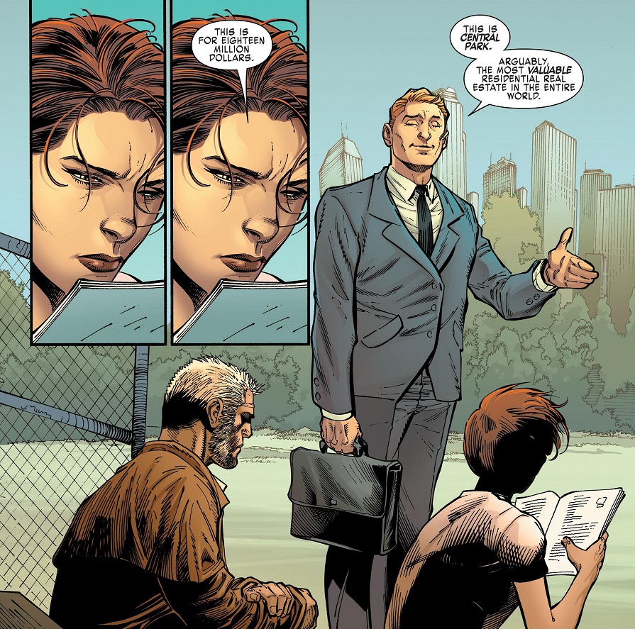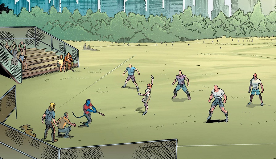 Later, during a baseball game outside the new Xavier Institute for Mutant Education and Outreach in Central Park, Kitty and Old Man Logan talk about how great it is that things are getting back to basics. Then Alex Sandstrom from the City Register comes along and presents Kitty with an $18 million bill for the first six months’ rent and property taxes. She seems shocked at the cost, even though it was entirely her idea to just plop the new school RIGHT IN THE MIDDLE OF CENTRAL FREAKIN’ PARK!