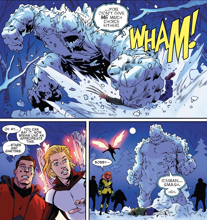 The Young X-Men head up to the frozen wilderness to track reports of a strange mutant. They meet the local sheriff from a few issues back, and she quickly leads them all to Jimmy Hudson, who has gone pretty feral. Everybody does their best to subdue him, and then Iceman hulks out and just smashes Jimmy into submission. Everybody heads to the local bar to talk to Jimmy to find out what’s going on (and we get a little flashback to that one time the Young X-Men had a crossover with the Ultimate X-Men, so some of these characters already know Jimmy). But Jimmy doesn’t remember anything.