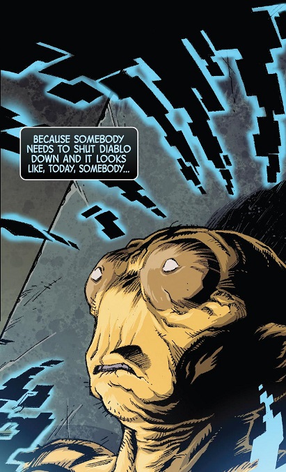 This was an awesome issue. One of the best of the series. Mosaic’s character has never been stronger, and Thorne really cuts loose with the trash talk and attitude that are unique to Morris Sackett. There are no other superheroes like him at Marvel or DC and it’s fun to read. I personally think Diablo is a horrible choice for the villain, since he doesn’t have any real way to connect to the hero, but Thorne still makes it work. He uses the rather creative idea of teaming up Diablo with the Moloids, and then uses the hero’s unique power set to solve this unique crisis in a unique and interesting way!