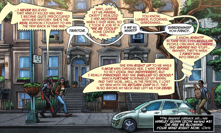And being an Internet scribe who loves Conner and Palmiotti’s Harley Quinn comic, and possibly one of the only people on the Internet who thinks this is a big deal, I thought I’d chronicle their page-twisting, deep cutting new reveal! Someone’s got to let them know that we readers love and appreciate their nifty storytelling and long term character-building!