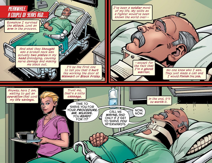That then reminded me of the fact that we’ve already seen Red Tool’s origin! Back when he first appeared, in Harley Quinn #26! We were told the parallel story of how an older, mustachioed man went crazy, got a bionic arm and eventually started loving tools. At the time, I was a little confused because these cutaways came out of nowhere. How was I supposed to remember that We-B-Tools doorman all these years later?