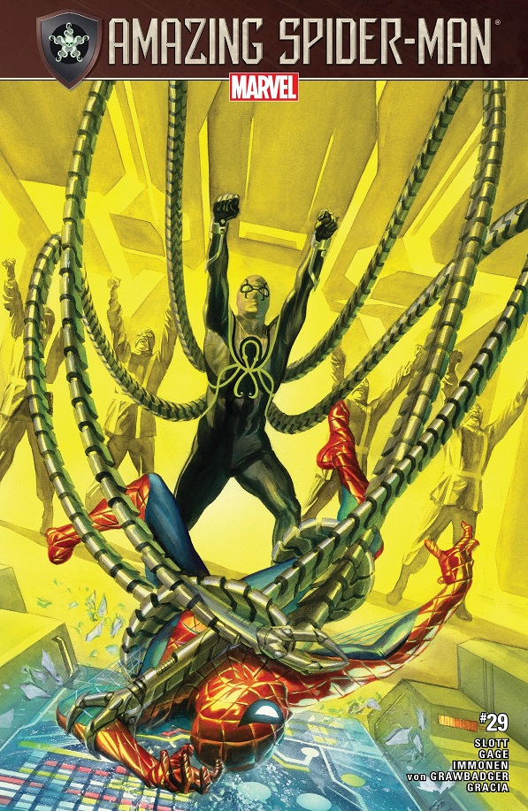 When Secret Empire struck, Peter Parker was in the middle of a TV interview trying to make amends for what his company did during the invasion of Symkaria. When all the HYDRA stuff happens, Spidey heads out into the city and finds his company overrun with goons. They get into a fight, but their boss calls them off. Peter goes up to meet him and it’s the Superior Octopus! He wants Peter to hand the company back over to him, since Otto is the one who started it, after all.