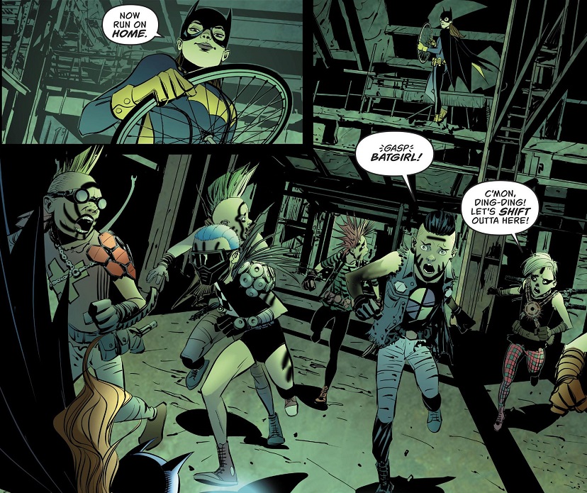 Batgirl comes across Esme, one of her students, standing up to a gang of punk kids in a warehouse in Burnside late one night. After Batgirl scares off the punks (a prepubescent gang called the Shifties), she finds out that Esme is searching for Rookie, the Internet-famous fire dog, who has gone missing. Esme follows a lot of celebrity dogs on Pixtagraph. Batgirl is about to take Esme home, but then they spot Catwoman nearby, and Batgirl brings Esme along rather than let the thief get away.
