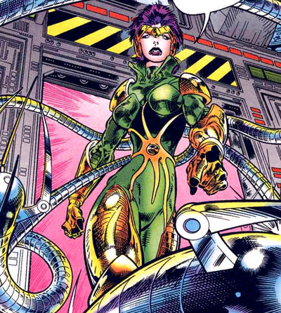 Lady Octopus is a personal favorite of mine. She came to power for a short period during Spider-Man’s Clone Saga in the 1990s, when the original Doctor Octopus was temporarily dead. Carolyn Trainer was a student of Otto Octavius, and took up his mantle after he died. She took on Spider-Man and his various clones and — in very ’90s fashion — was really big into virtual reality and cyberspace. And this was back when they called it the “Information Superhighway”. Remember that? Anyway, Lady Octopus faded into the background when the real Doc Ock returned, but she makes the occasional appearance nowadays, mostly as a joke.