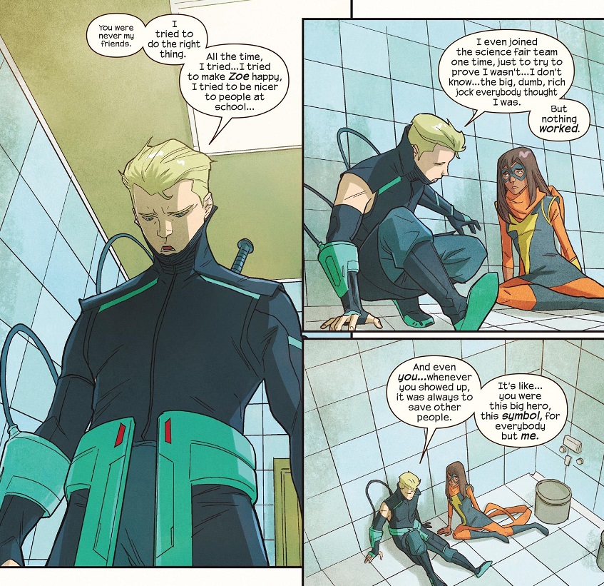 Josh is the white male who is constantly told he has white privilege, but can’t see it because his life sucks just as much as everybody else’s. And when Ms. Marvel is a champion of minorities, rightfully so, does that mean straight, white guys like Josh are excluded?
