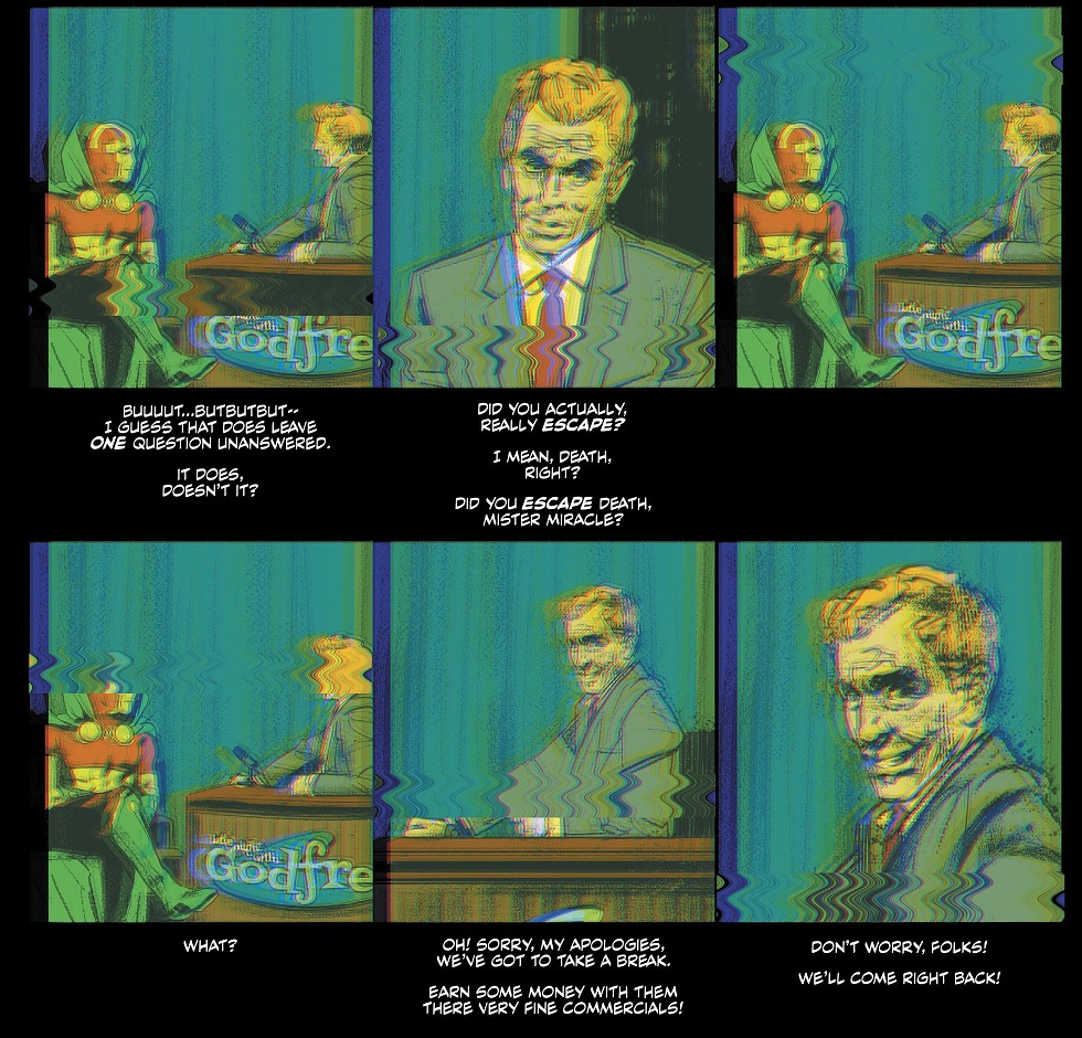 Scott Free returns home after slitting his wrists. Was it a suicide attempt? Or was the ultimate escape artist simply trying a new stunt: escaping death? While he recovers, Scott starts to notice odd little changes to the world, like the color of his wife’s eyes. Or that he’s able to have a full conversation with his old friend Oberon, but Barda tells him that Oberon died the month prior. And when Scott goes on a talk show to discuss his stunt (an interview we watch via crappy VHS recording), the host ominously asks Scott if he really escaped death. How would Scott even know?