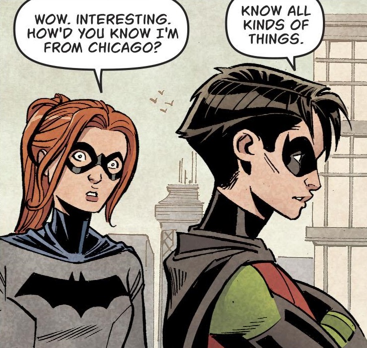 Batgirl and Nightwing are both summoned to the same rooftop by a mysterious text message, where they run into a pair of villains dressed like costumed acrobats — and who promptly dive off the roof, hand-in-hand, claiming “her” blood is on their hands. Babs and Dick immediately think about a woman named Ainsley and some mysterious summer. Ainsley was a friend of Barbara’s from school and work shortly after she moved to Gotham City, at about the same time that Robin was starting to tease/flirt with the new Batgirl. Could this be related to her?