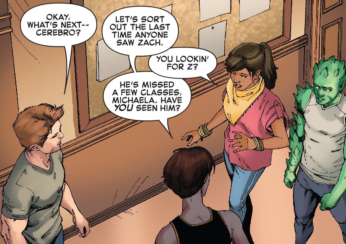 But Zach says he’s too awesome to spend his time doing pop quizzes and other school stuff. He’s a cool mutant and he wants to live a cool life! So he takes off in Daken’s helicopter, while Bobby traps Daken — but the villain sees through Bobby’s cool exterior and calls him out for being afraid deep down.