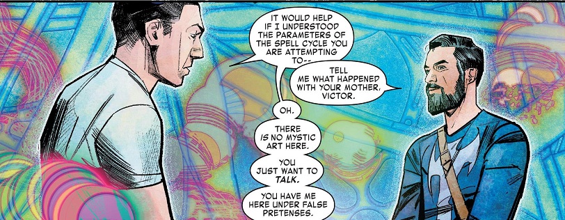 Victor Von Doom has turned himself in to SHIELD custody, and they’re holding him at Project Pegasus. Doctor Strange is called in to help mediate, and he goes into the cell to talk with Doom and figure out what has frightened his old foe so badly. The two meditate and discuss their shared history as Doom starts to see through Evil Reed Richards’ disguise. Meanwhile, Evil Reed arrives at Project Pegasus to offer his help with Doom, but SHIELD doesn’t give him an inch. Doom and Strange figure out the ruse and rush outside to help, just as Evil Reed drops his facade.