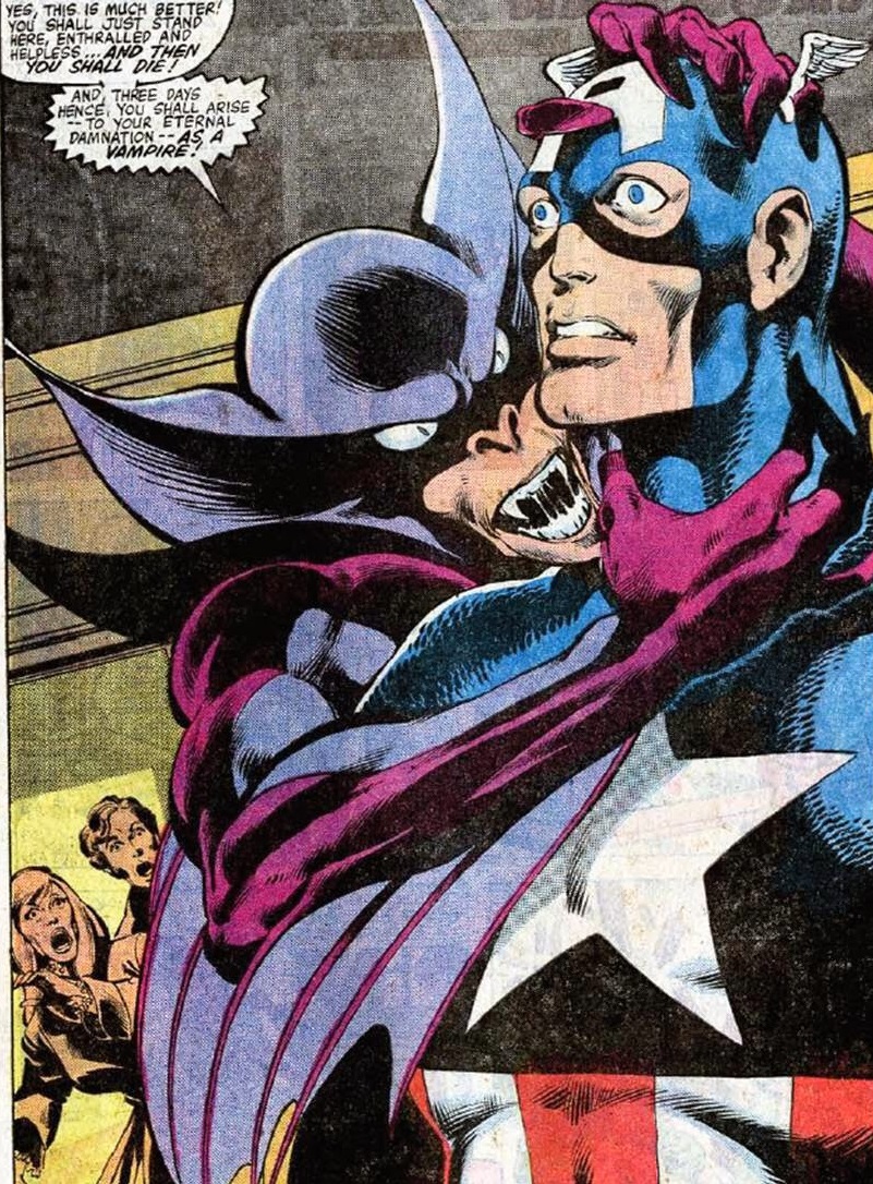 I looked and looked and looked, and apparently there just aren’t any bat-themed heroes or villains at Marvel Comics! Probably for good measure. You don’t see many spider-heroes over at DC. But one very bat-looking fellow at Marvel is Baron Blood, the vampire villain that Captain America fought in World War II! There have been several Baron Bloods over the years, but the original was a British aristocrat who was transformed into a vampire by Dracula himself! He then went on to join the Nazi super-villains and get his butt whooped by Captain America and his allies. But being a vampire, he’s constantly coming back from the dead and donning that sweet bat gear!